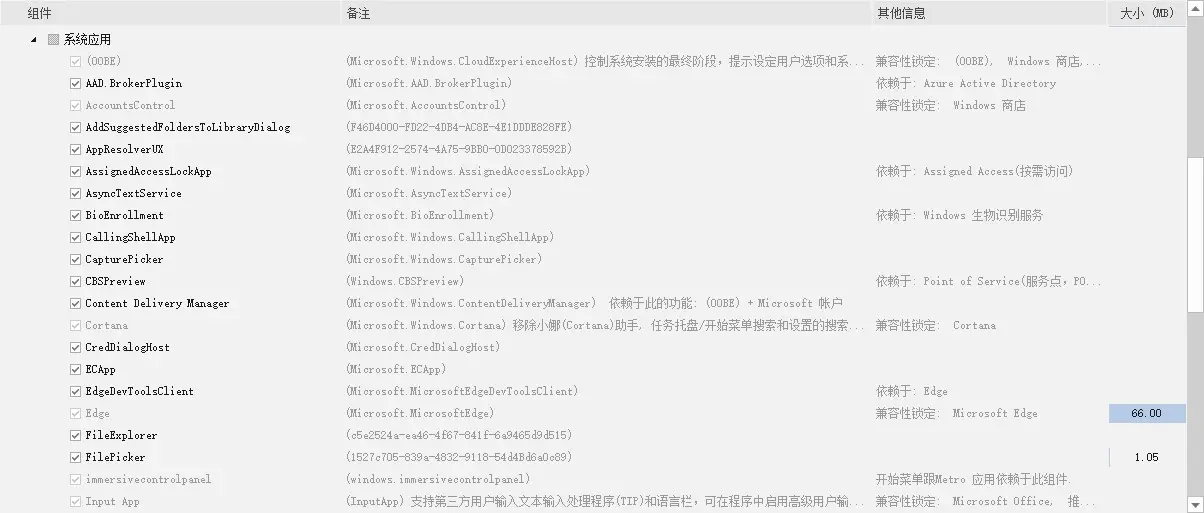 “系统应用”组件下就是系统自带的应用,大家可以根据自己的喜好进行删除,其中“Window Defender"是系统自带的安全软件。不过它喜欢搞事情,比如它会清理掉你下载的盗版游戏啊、盗版软件啊、激活工具啊、破解工具什么的,所以你懂的。。。(呼吁,大家支持正版哈。。。),其他选项同样同学们可以按需取舍。