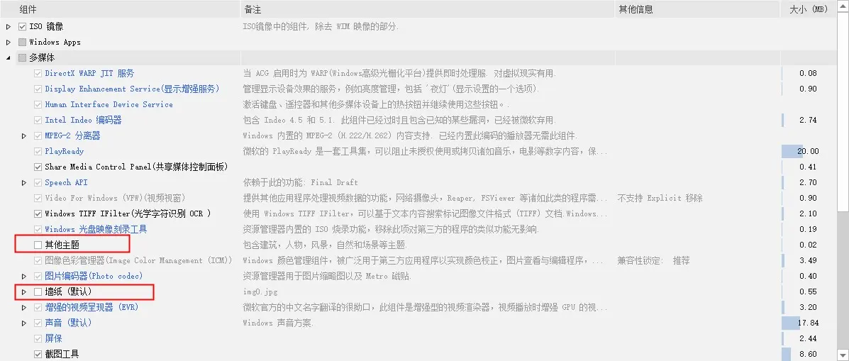 “多媒体”组件下,我去除了“其他主题”和“墙纸”,其他选项同样同学们可以按需取舍。