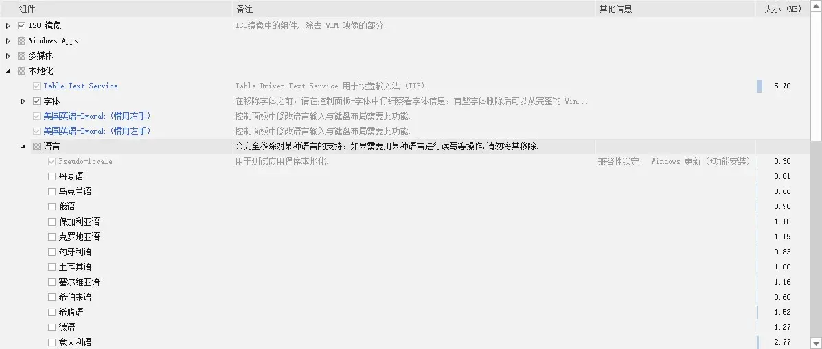 “本地化”组件下的“语言”,我这边只保留了“简体中文”,其他选项同样同学们可以按需取舍。