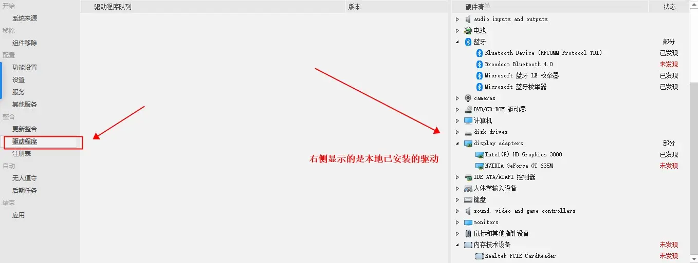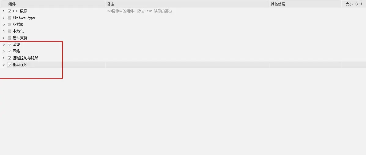 “系统”、“网络”、“远程控制与隐私”和“驱动程序”四个组件小白的话不建议操作。