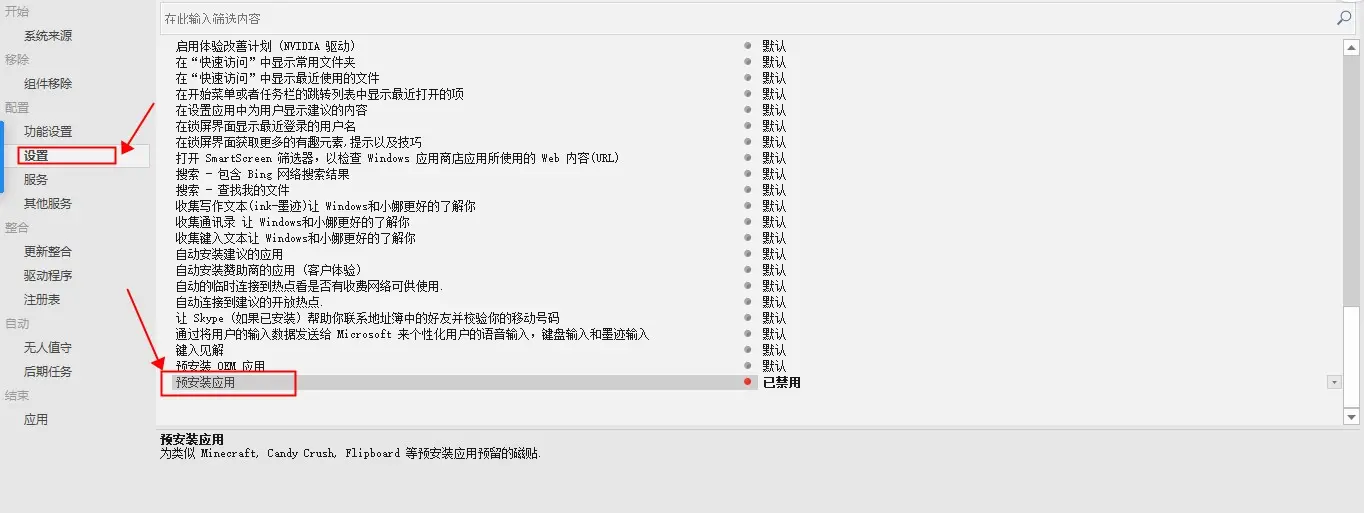 其中,”设置“选项下的”预安装应用“记得禁用掉