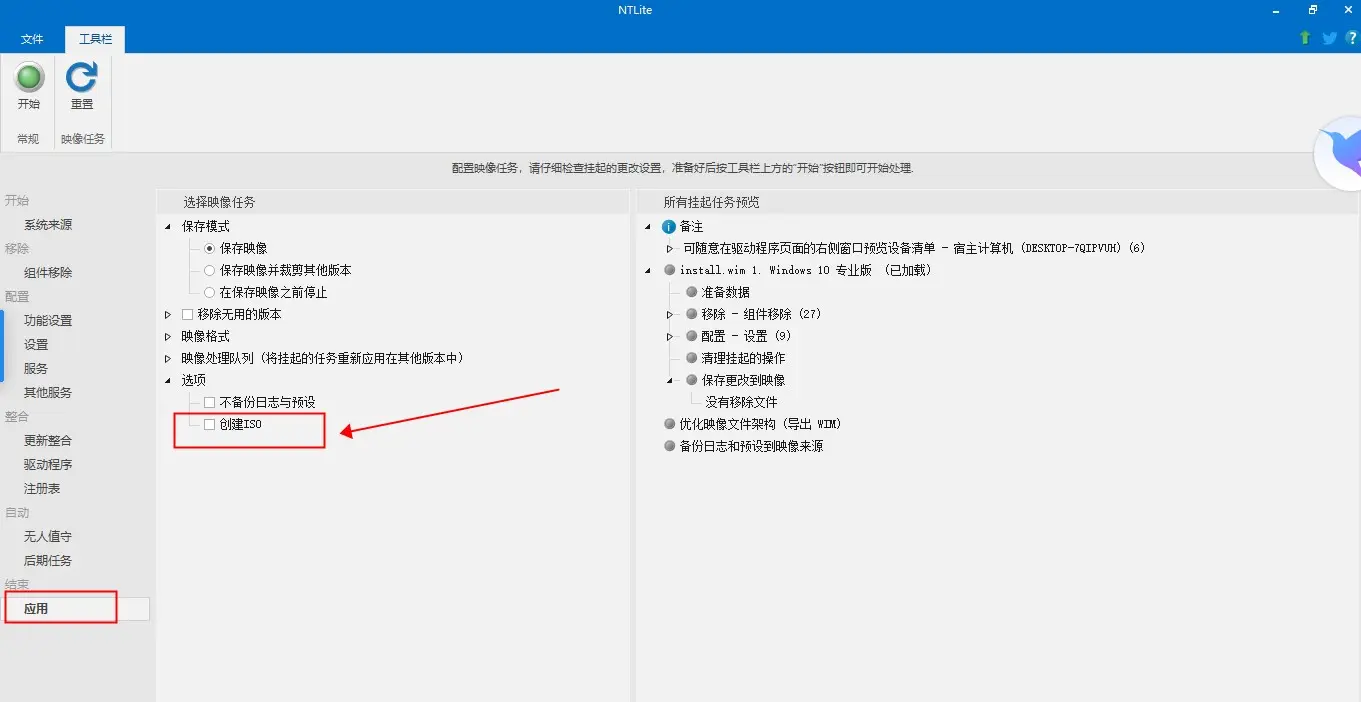 点击”应用“,勾选”创建ISO“,会让你选择文件要保存的位置,选好位置点击”保存“,之后会让你给卷标命名