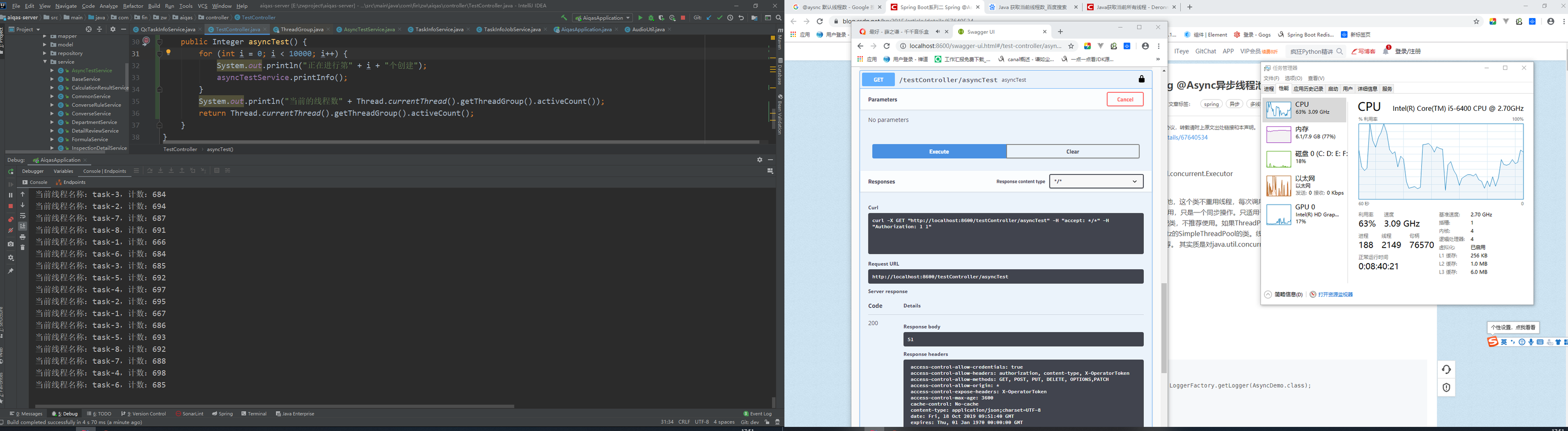 想要使用@Async异步注解,首先我们就必须要用到@EnableAsync注解,在SpringBoot启动类中设置打开异步注解功能。 @EnableAsync(proxyTargetClass = true),然后你就可以在项目中任意的需要异步的方法上加上@Async了。