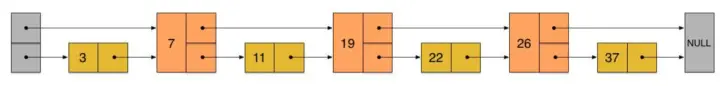 假如我们每相邻两个节点增加一个指针(或者理解为有三个元素进入了第二层),让指针指向下下个节点。