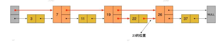 现在当我们想查找数据的时候,可以先沿着这个新链表进行查找。当碰到比待查数据大的节点时,再回到原来的链表中的下一层进行查找。比如,我们想查找 23,查找的路径是沿着下图中标红的指针所指向的方向进行的: