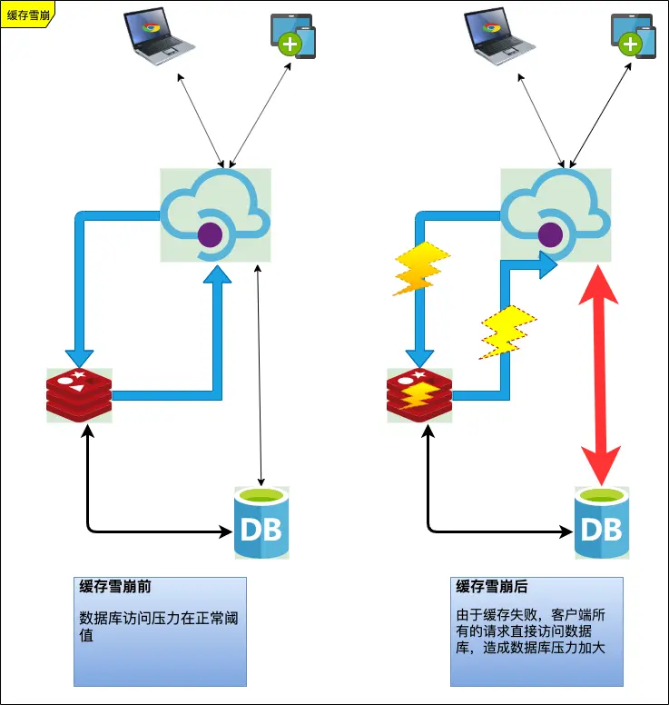 Redis集群大面积故障,但仍然有大量的请求访问缓存访问,由于缓存失败,大量的请求则转向数据库如MySQL,MySQL不能快速做出相应或者停止工作。由于大量的应用依赖MySQL和Redis,它将会导致服务器集群崩溃。最终应用(网站)将测底瘫痪。