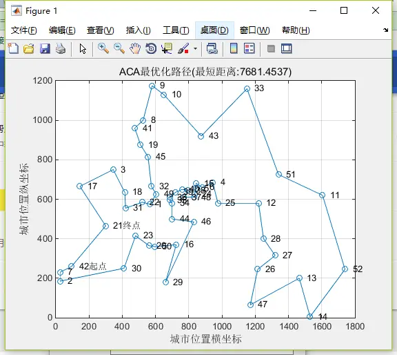 title(['ACA最优化路径(最短距离:' num2str(Shortest_Length) ')'])