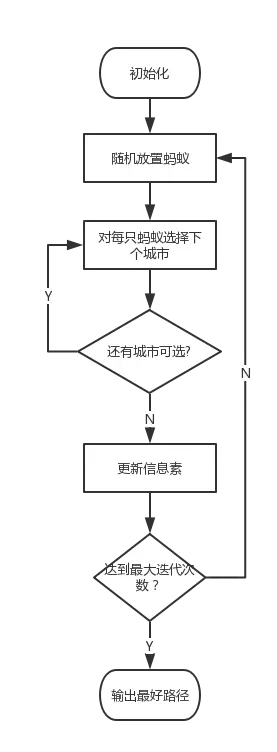 。初始时刻,蚂蚁被放置在不同的城市里,且各城市键连接路径上的信息素浓度相同。然后蚂蚁将按一定概率选择线路,不放设