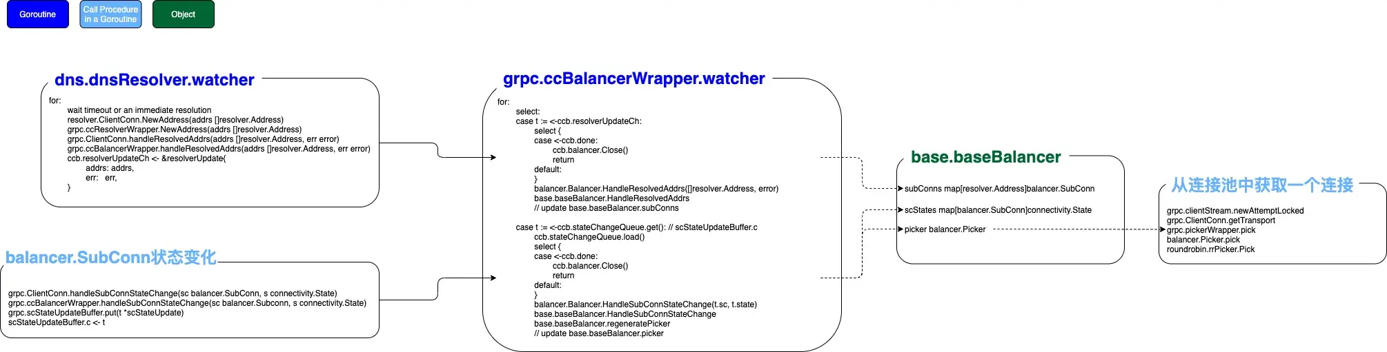 - grpc.ccBalancer.Wrapper 会启动一个 goroutine,负责监听服务地址更新事件和连接状态变化事件
