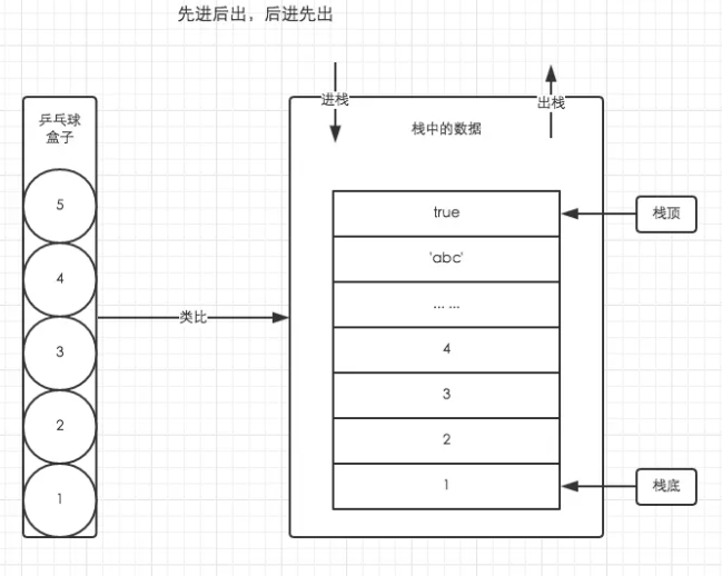 要简单理解栈的存取方式,我们可以通过类比乒乒球盒子来分析。如下图左侧。