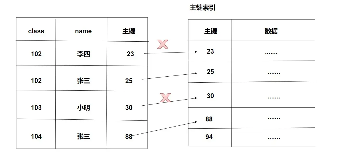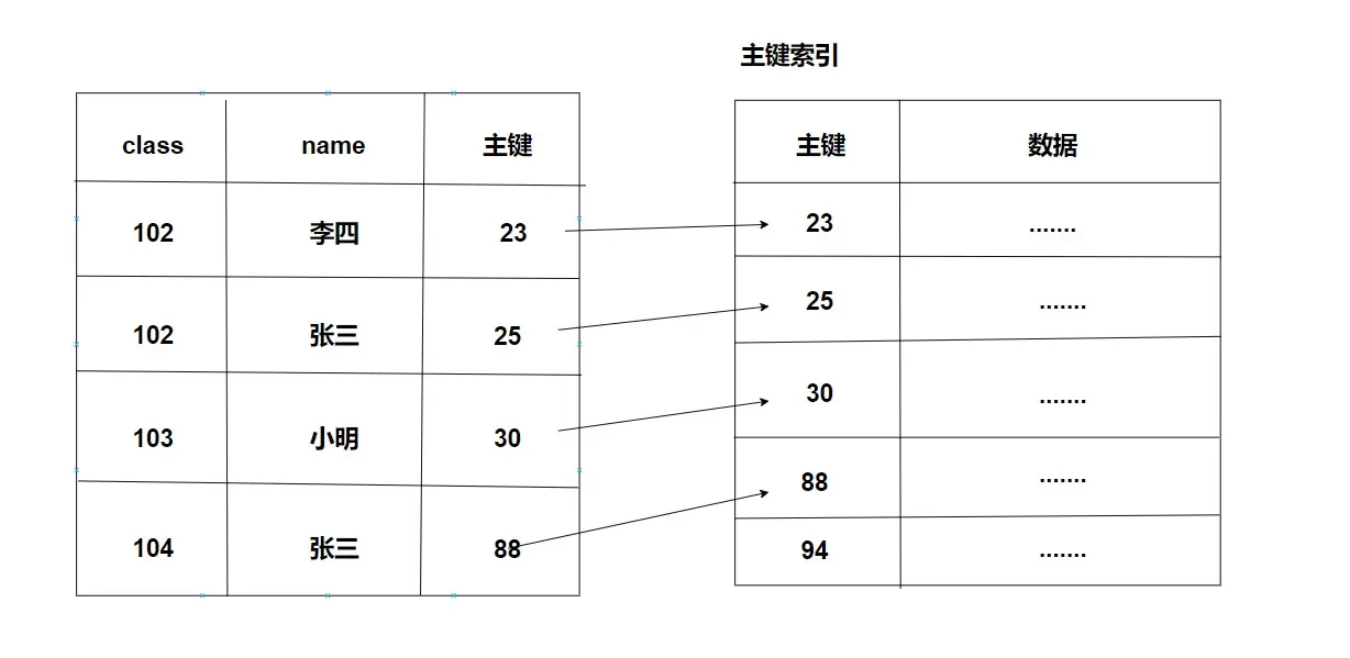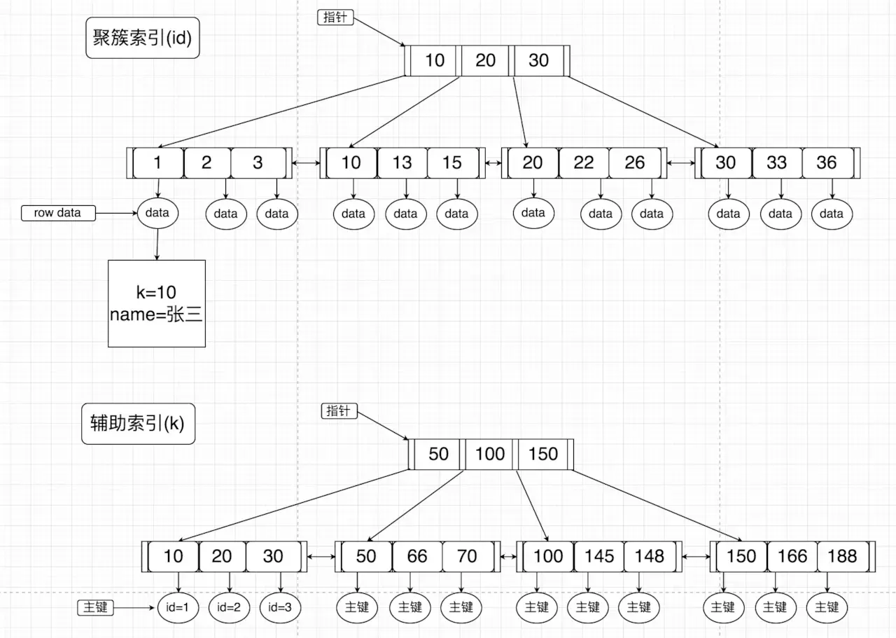 一个是 主键 的 聚簇索引,另一个是 普通索引 的 辅助索引,这里我直接贴上 MySQL浅谈(索引、锁) 这篇文章上面的贴图(因为我懒不想画图了。。。)