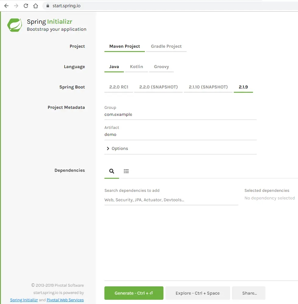 首先,在浏览器中,输入 start.spring.io/,会看到如下界面: