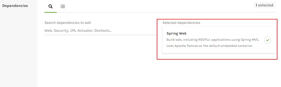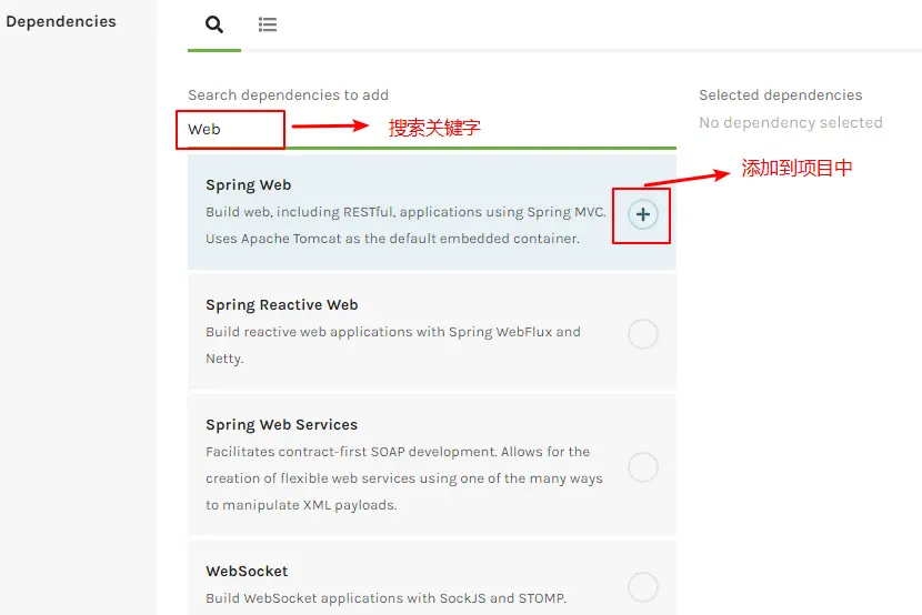 接着选择依赖项,比如要添加Web依赖项,这里可以按关键字搜索Web依赖项,如下所示: