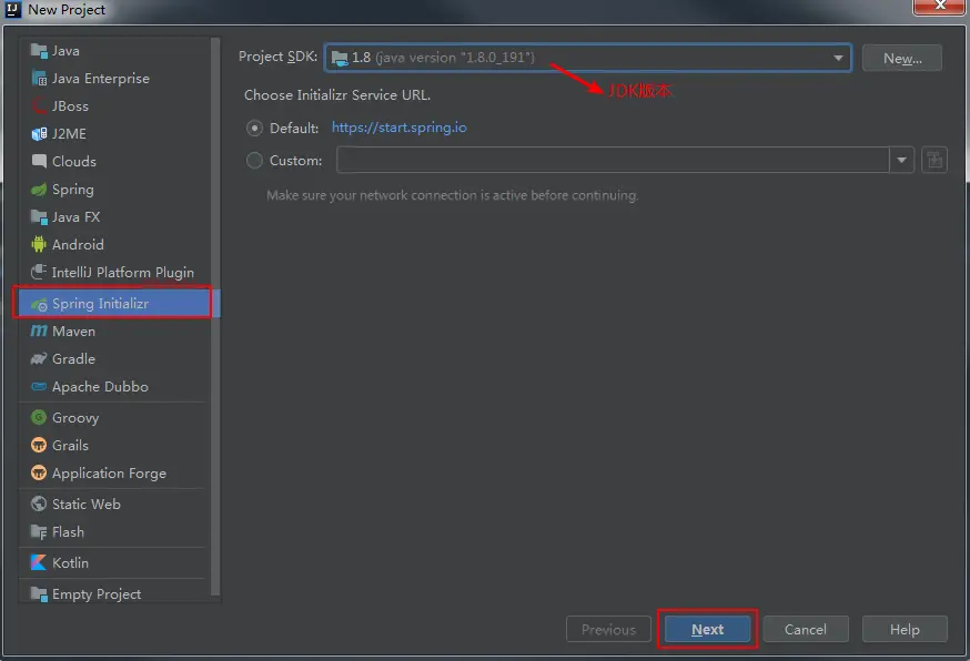 首先,打开开发工具IntelliJ IDEA,依次点击菜单File--New--Project打开新建项目对话框,先选中左侧的“Spring Initializr”,然后选择项目要使用的JDK版本,如1.8,点击"Next"按钮:
