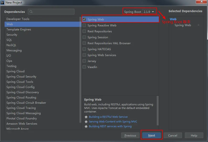 选择项目要使用的依赖项(如Spring Web)以及Spring Boot的版本(如2.1.9),点击”Next“按钮: