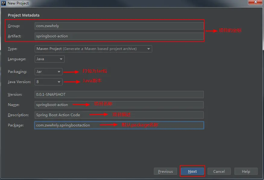 按照下图中的提示填写好项目信息、打包方式、Java版本等信息,点击“Next"按钮: