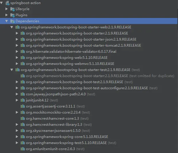 和默认的2个依赖一样,我们并未指定该依赖的version版本,但是在Maven的依赖树里,却能看到这3个依赖使用的版本,如下所示: