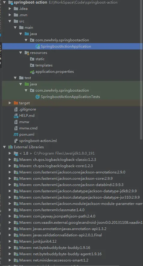 找到启动类SpringbootActionApplication(名称一般为ArtifactId+Application),看到默认代码如下: