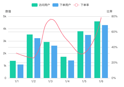 { '日期': '1/2', '访问用户': 3530, '下单用户': 3230, '下单率': 0.26 },