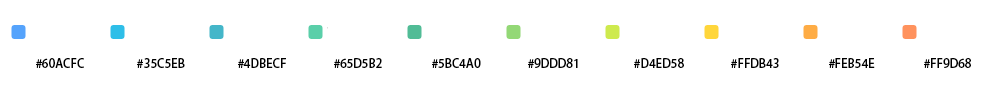 colors: ['#60ACFC', '#35C5EB', '#4DBECF', '#65D5B2', '#5BC4A0', '#9DDD81', '#D4ED58', '#FFDB43', '#FEB54E', '#FF9D68']