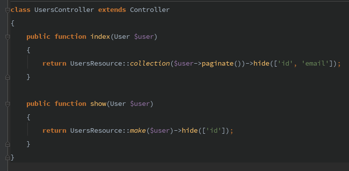 让我们从 show 方法开始. UsersResource::make 将会返回 UsersResource 的对象. 因此,我们应该揭开 hide 的神秘面纱,它可以存储我们期望从响应中移除的键.