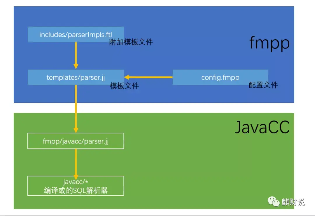 Calcite 使用 javacc作为语法解析器,并且使用freemarker作为模板引擎,在编译的时候,freemarker会将配置文件与模板语法文件以及附加文件整体生成最终的语法文件,并通过javacc编译,形成calcite的语法文件。其整个过程如下图所示