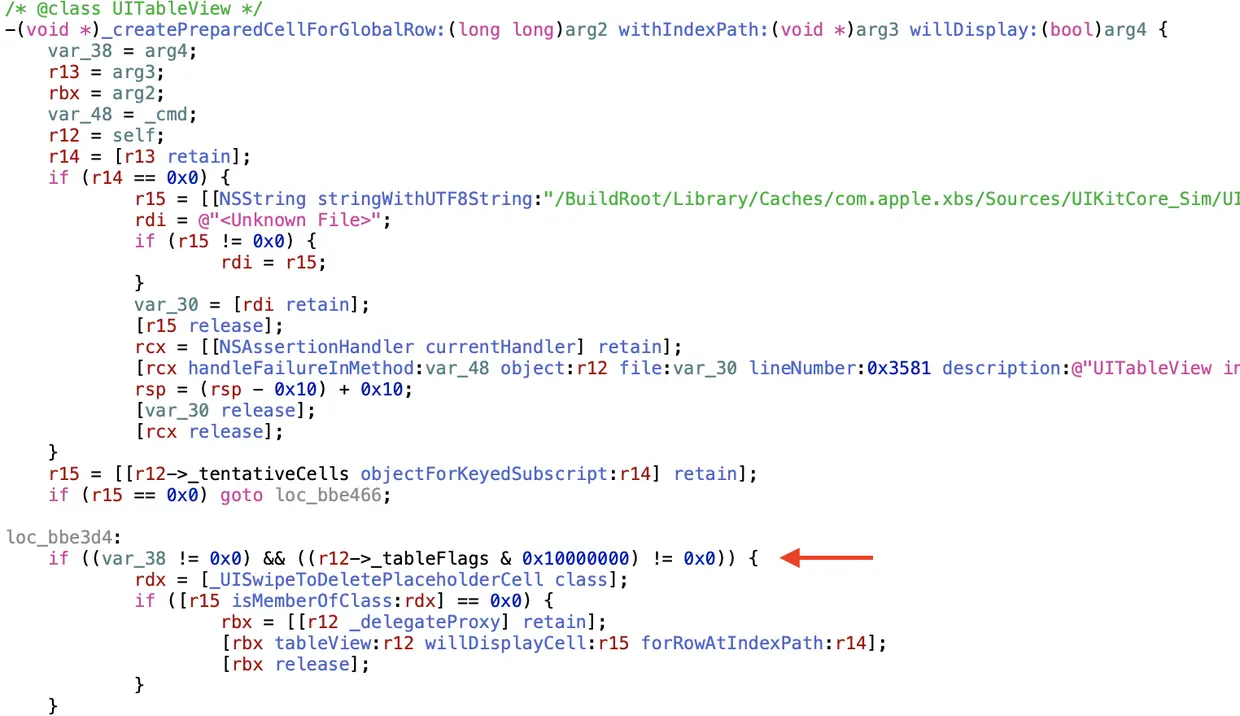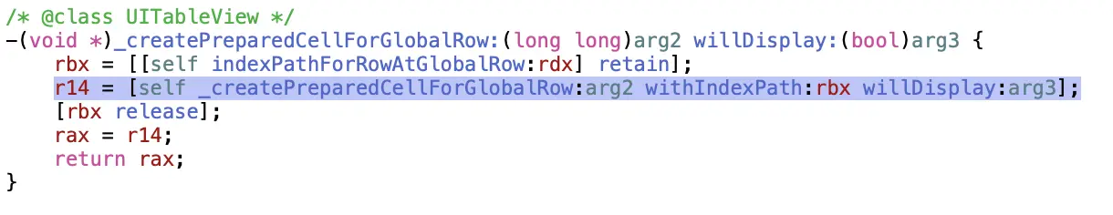 我们分别来看三个方法的实现。这里使用Hopper Disassembler,在Hopper里打开UIKitCore.framework,等分析完毕,搜索 -_createPreparedCellForGlobalRow:willDisplay:并定位,代码如下: