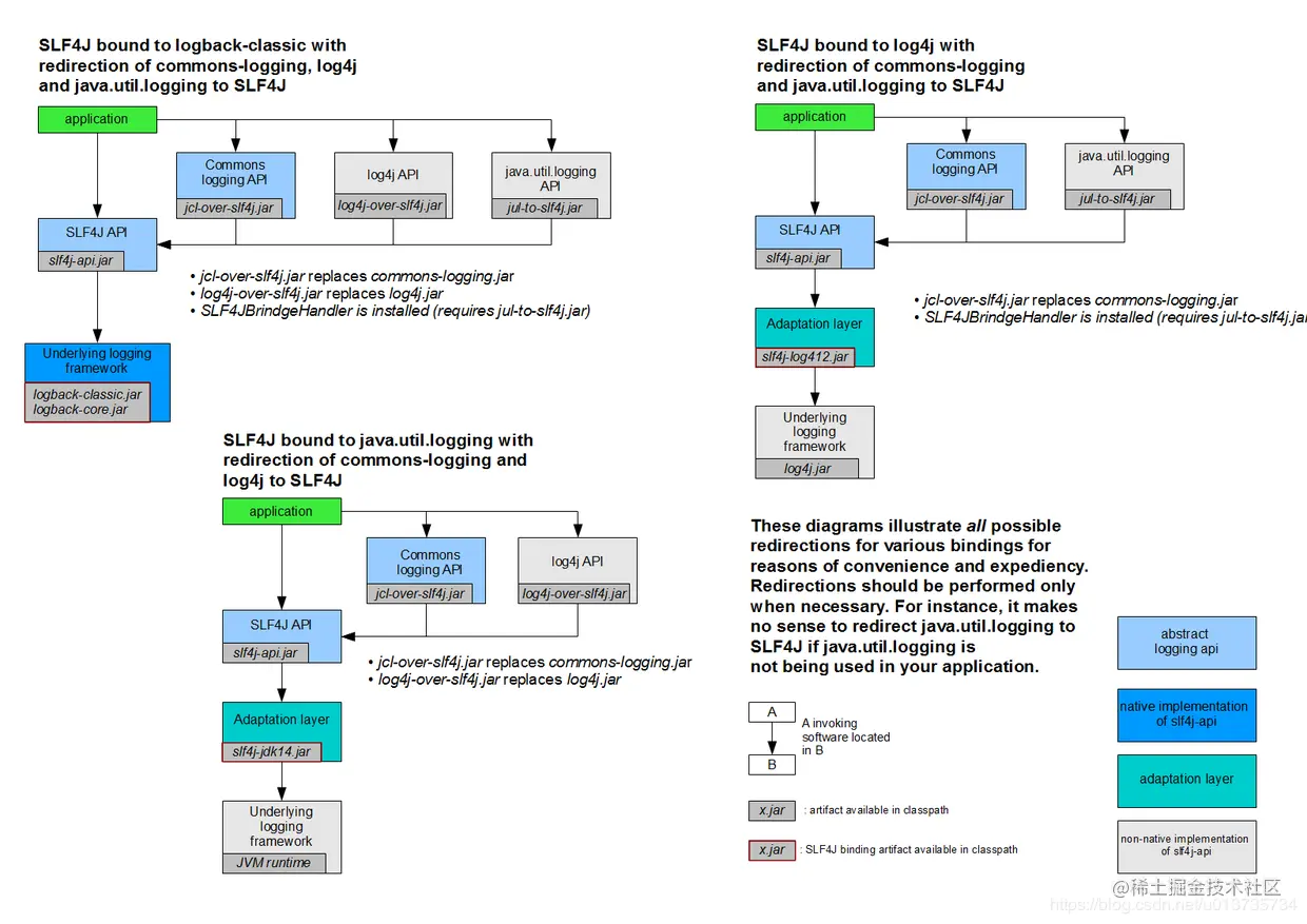 下图是 SLF4J 结合各种日志框架的官方示例,从图中可以清晰的看出 SLF4J API 永远作为日志的门面,直接应用与应用程序中。