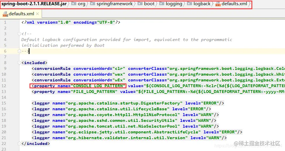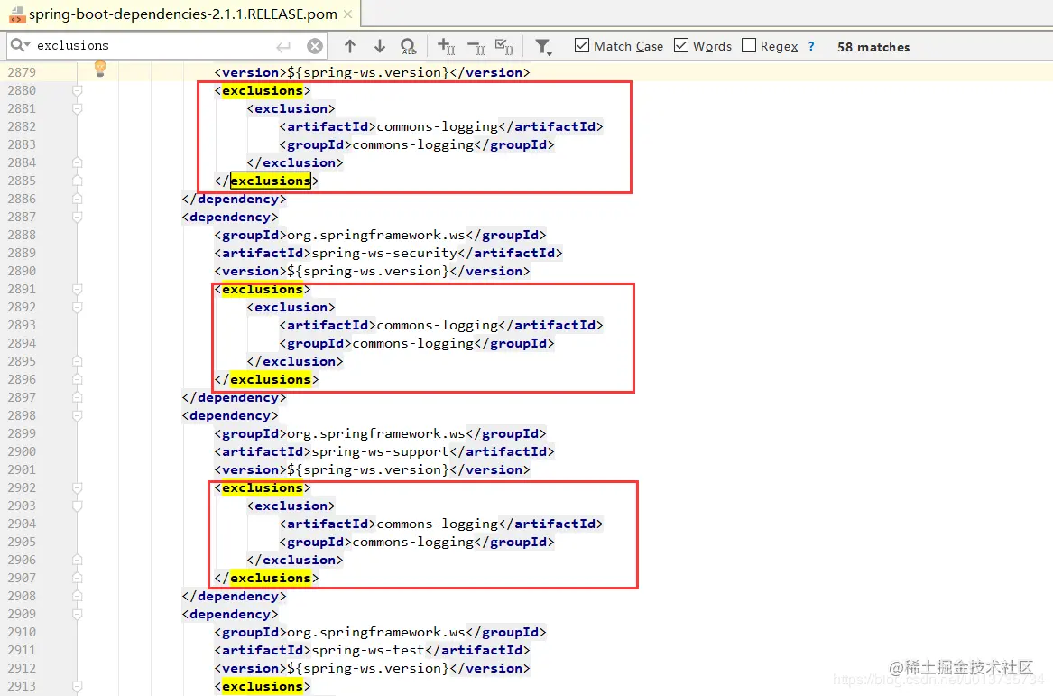 根据上面总结的要统一日志框架的使用,第一步要排除其他的日志框架,在 Spring Boot 的 Maven 依赖里可以清楚的看到 Spring Boot 排除了其他日志框架。
