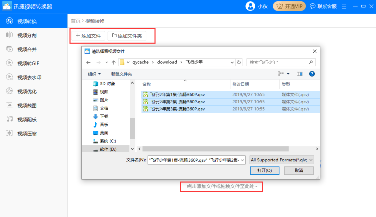1、首先把在爱奇艺下载好的视频添加到迅捷视频转换器中。添加的时候可以点击“添加文件”或“添加文件夹”按钮,也可以用拖拽的方式直接把qsv视频拖拽到软件中。