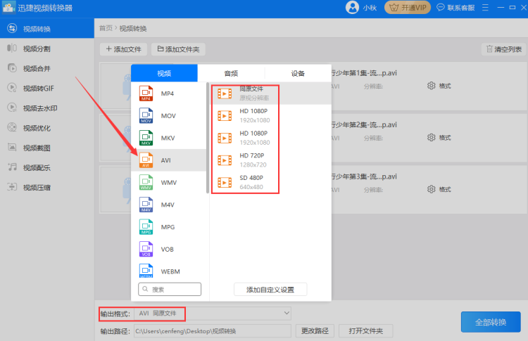 2、添加好视频后设置输出到电脑的“格式”或“输出格式”,输出格式又分为视频格式和视频分辨率。因为要把qsv格式转换成avi格式,所以把视频格式设置为‘avi’格式。