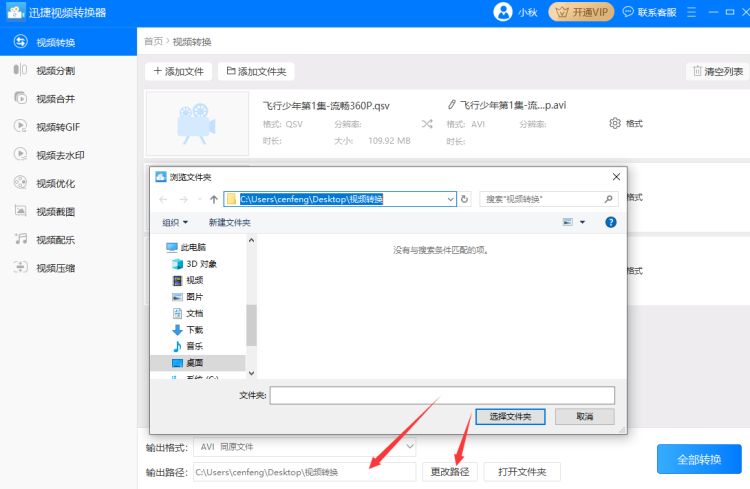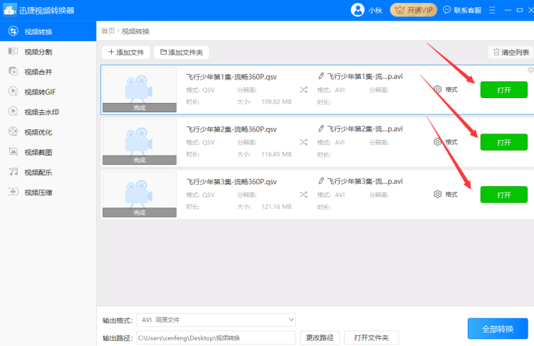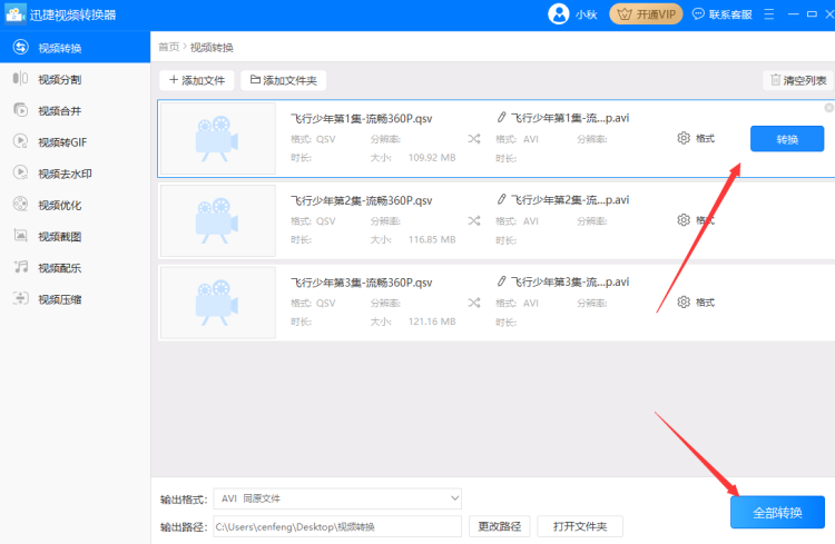 4、设置好输出路径后依次点击“转换”按钮单独转换需要转换视频格式,也可以直接点击软件右下角的“全部转换”按钮统一把qsv格式转换成avi格式。