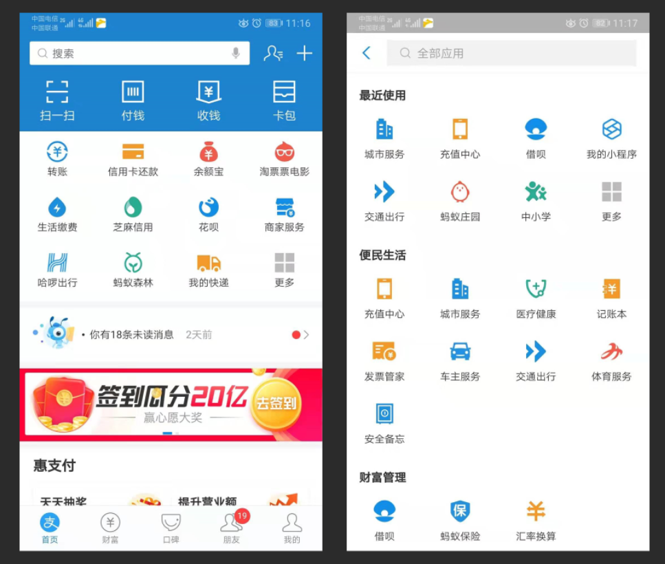 再比如,支付宝战略是:链接和“钱”有关系的一切服务。因此,在范围层就不在对“社交”抱有太大的执念,而是也不断扩充相关功能服务,例如:转账、余额宝、记账本、彩票、生活缴费、发票管家,等等…
