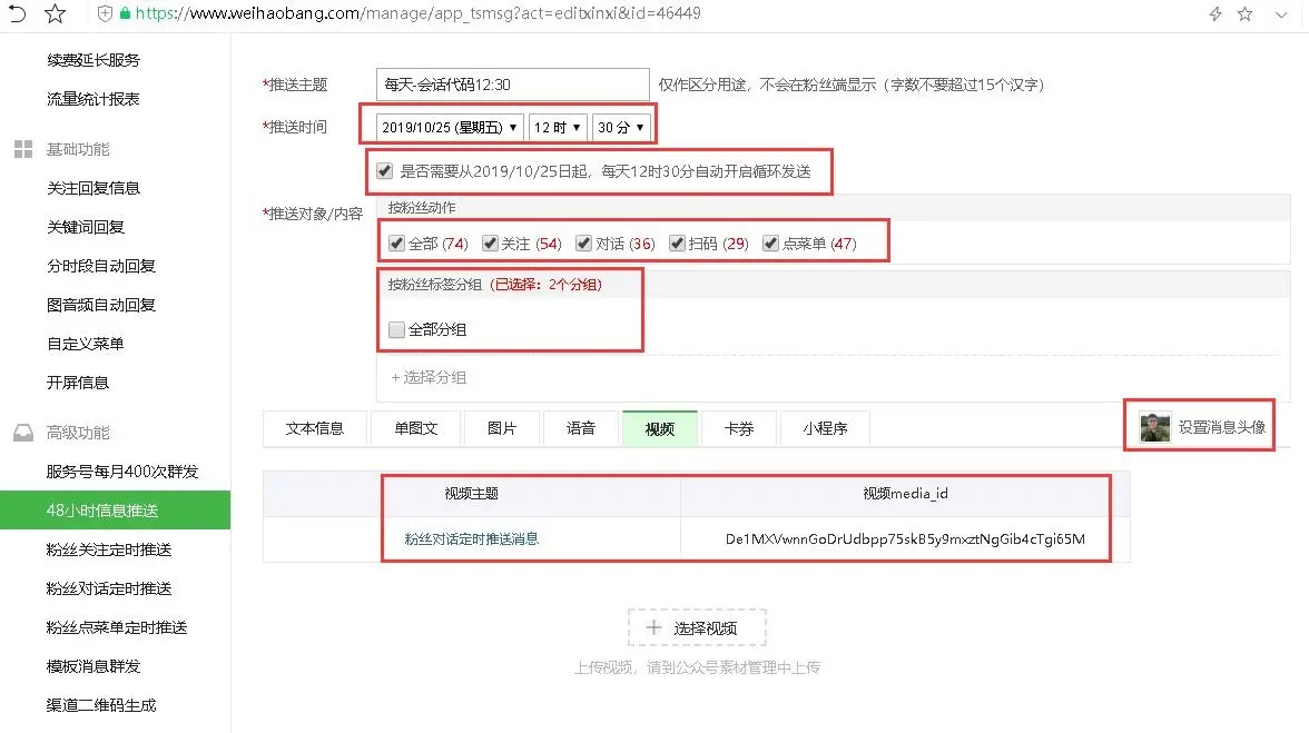 微号帮平台48小时客服消息推送设置了视频消息,视频在公众号素材管理中上传,也可以发送文本信息、单图文、图片、语音、卡券、小程序。