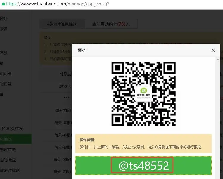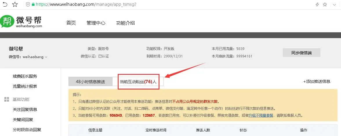 48小时信息推送,仅对公众号48小时内互动活跃的粉丝不限制次数推送消息,微号帮平台自动统计这些粉丝然后推送消息。