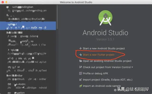 Android Studio 创建Flutter项目的入口 如果看了我上篇文章Androidsutdio搭建Flutter开发环境的人应该知道Androidstudio安装Flutter开发插件的方法,如果安装成功后,打开AndroidStudio在首页会看到如下红圈里面的图片: