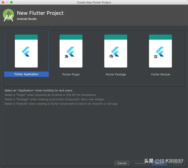 就是点击 Start a new Flutter project 按钮,弹出如下界面,这个界面是选择Flutter的类型,