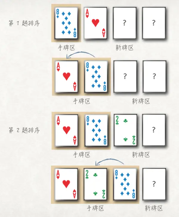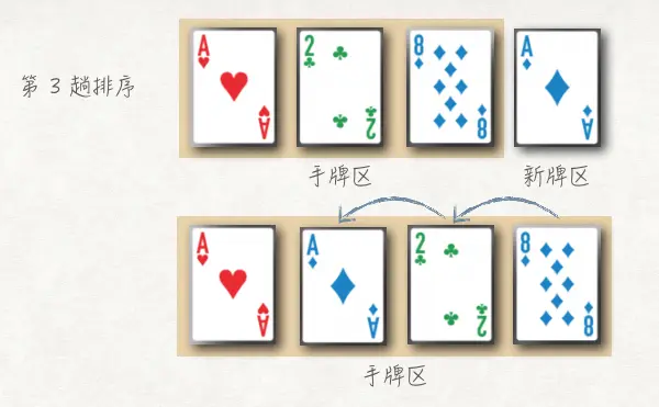 当最后一趟排序结束时,所有牌都进入手牌区,排序结束。