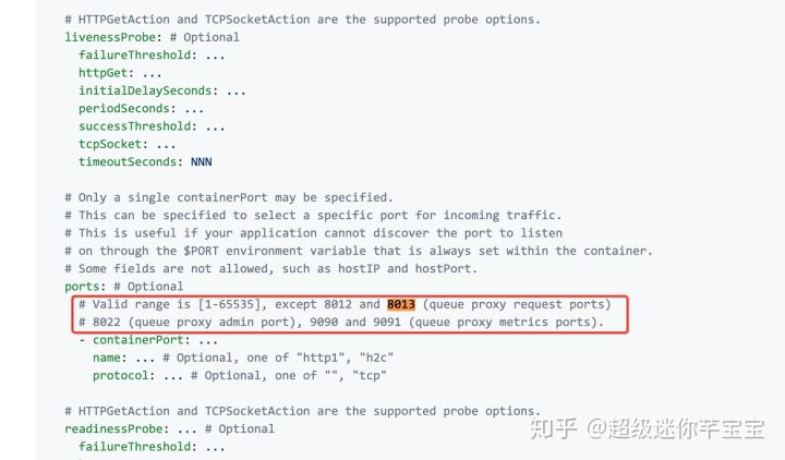 Knative Service 可以给容器添加 ports 字段,并且 ports 只能设置一个端口。ports 有两个关键字段 Name 和 ContainerPort