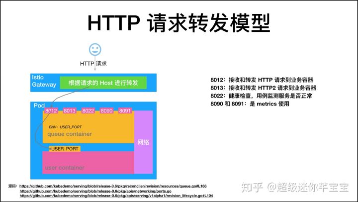 如果使用 Knative Serving 部署一个 Nginx 你可能会发现服务起来了,但是无法访问到 Nginx 中的服务。当然这不是 Nginx 的问题,这是因为 Knative 对 Container 的端口有要求。默认 Nginx 的服务端口是 80 ,而 Knative Serving queue 8012 默认是代理到容器的 8080 端口。所以如果业务容器监听的不是 8080 端口默认配置就不能对外暴露服务。