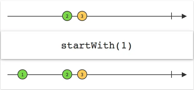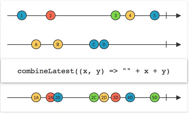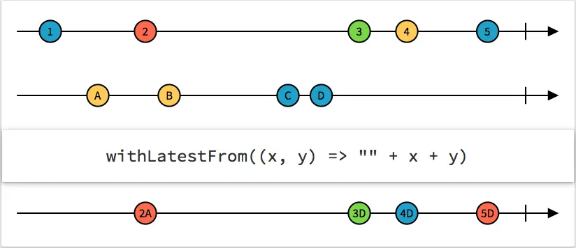 将两个 Observables 最新的元素通过一个函数组合起来,当第一个 Observable 发出一个元素,就将组合后的元素发送出来