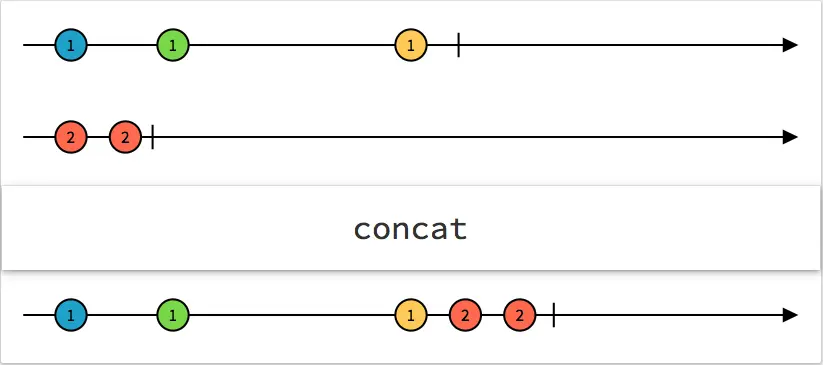 | concat | 第一个终止后,才会接收第二个,控制顺序 |