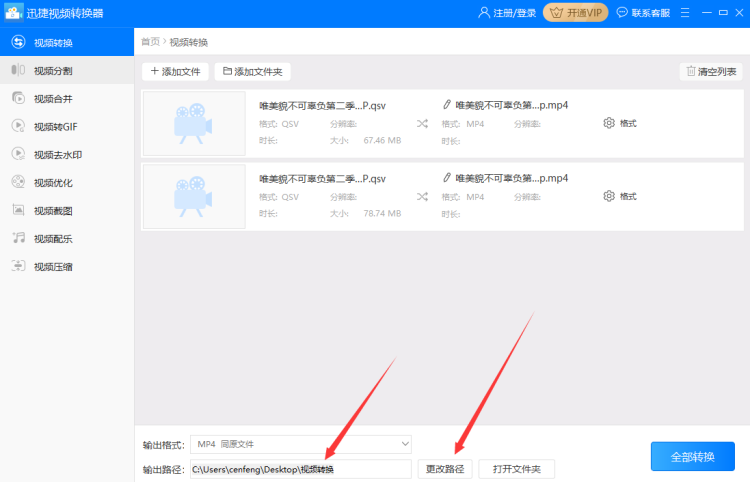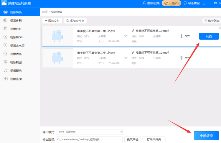 5、最后点击全部转换按钮就可以把你添加好的qsv视频根据所设置的参数转换成mp4格式,而转换好后只需到上一步设置好的输出路径中找到文件就可以了。
