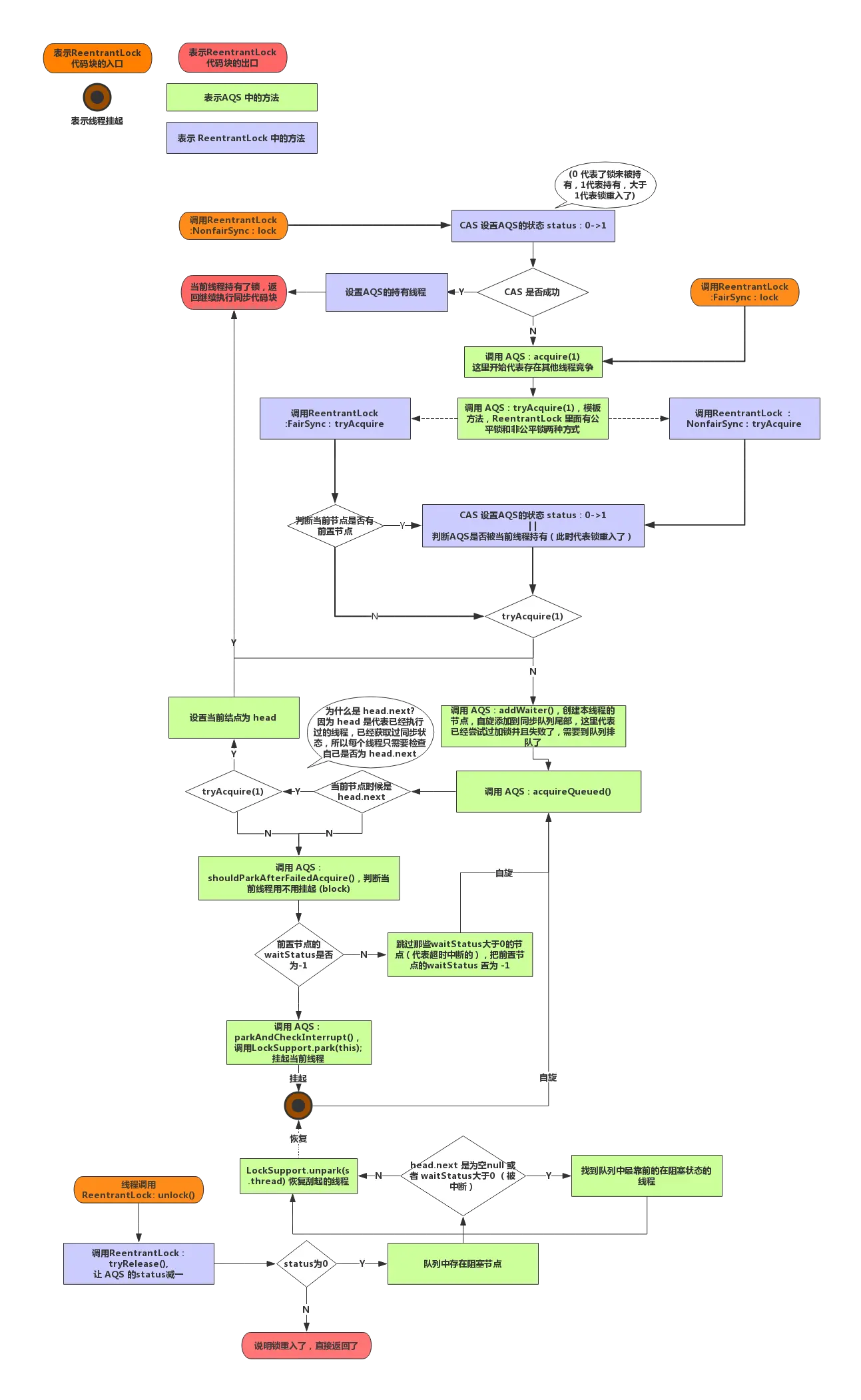 其实通过刚才对加锁过程的分析我们已经可以得到可重入锁就是当锁的持有对象就是本线程的时候,就对 state 的累加。不过由于解锁操作只是对 state 减一,所以当使用重入锁时,还是要记得调用对应次数的解锁操作。