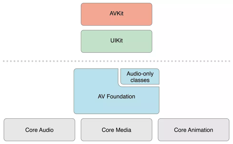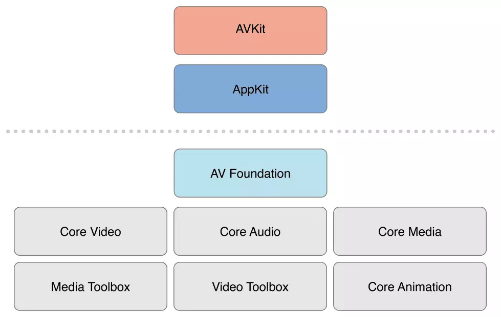 AV处于高层级框架和低层级框架之间,提供了很多低层级框架才能实现的功能和性能,并且是以更简单的OC接口方式实现,同时也可以和高层级框架无缝连接。