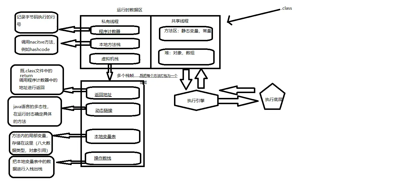 - 虚拟机栈:每个线程私有的,线程在运行时,在执行每个方法的时候都会打包成一个栈帧,存储了局部变量表,操作数栈,动态链接,方法出口等信息,然后放入栈。每个时刻正在执行的当前方法就是虚拟机栈顶的栈桢。方法的执行就对应着栈帧在虚拟机栈中入栈和出栈的过程。