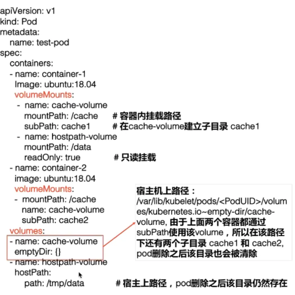 emptyDir:{}在宿主机上的路径是/var/lib/kubelet/pods//volumes/kubernetes.io~empty-dir/cache-volume,由于上面两个容器都通过subpath使用该volume,所以该目录下还有两个子目录cache1和cache2,pod删除之后该目录也会被清除。