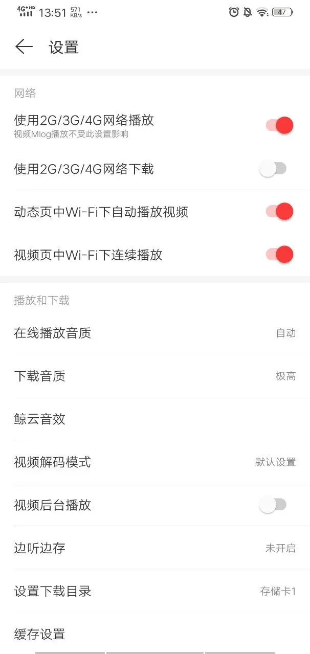 再比如,网易云音乐的设置里面把不同维度的内容放入不同的卡片中,然后用粗的分割线分开,在区分内容的同时,还保持界面的统一性。