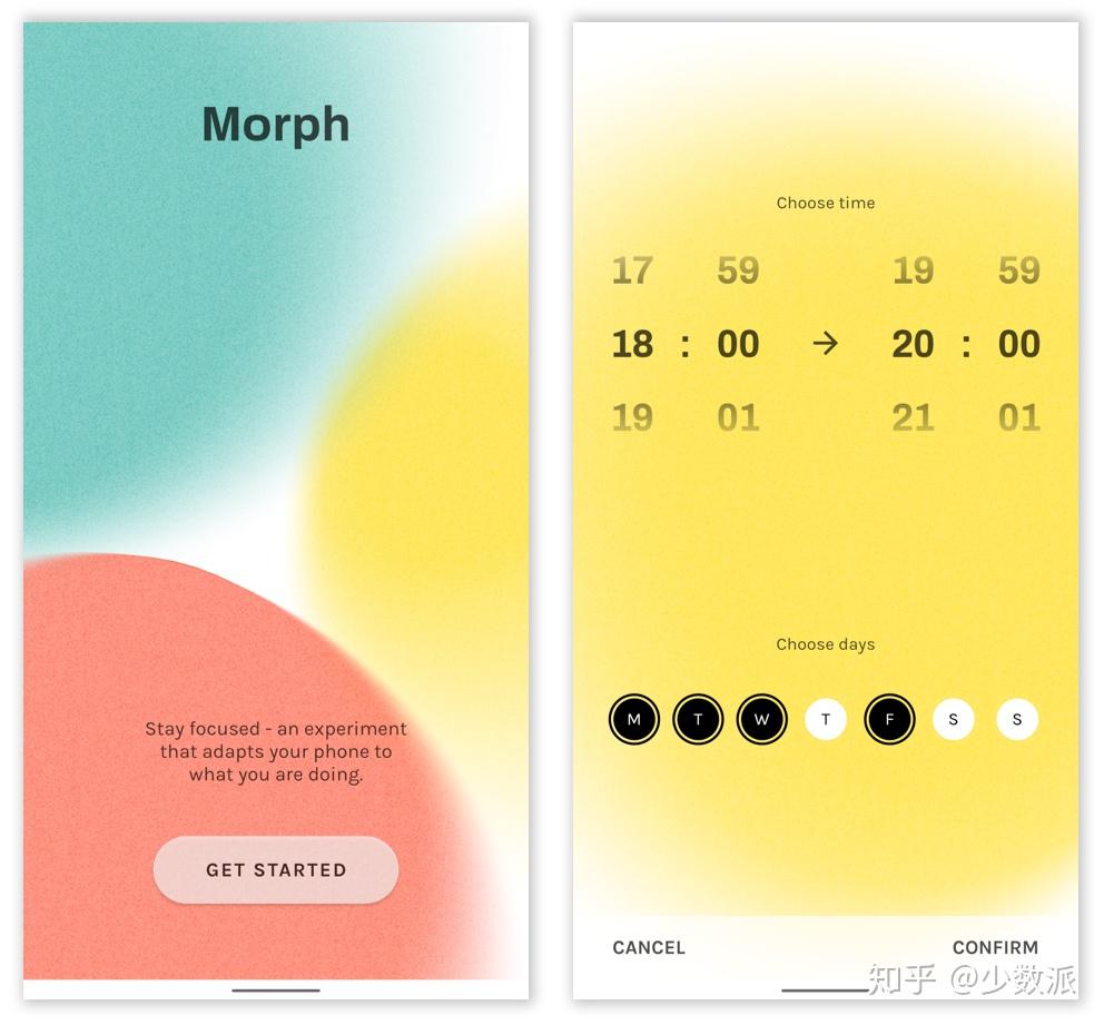Morph 要求我们根据自己的实际情况来为自己的应用使用方式建立不同的「模式(Modes)」,在特定模式下,只有提前选定的应用才会出现在主屏上,其它应用不仅不会带来视觉干扰,对应的通知也会被暂时屏蔽;Morph 针对不同的模式提供了时间和地点两种触发规则,允许我们根据具体情况自行设定,条件满足时,桌面主屏就会根据模式自行切换了。