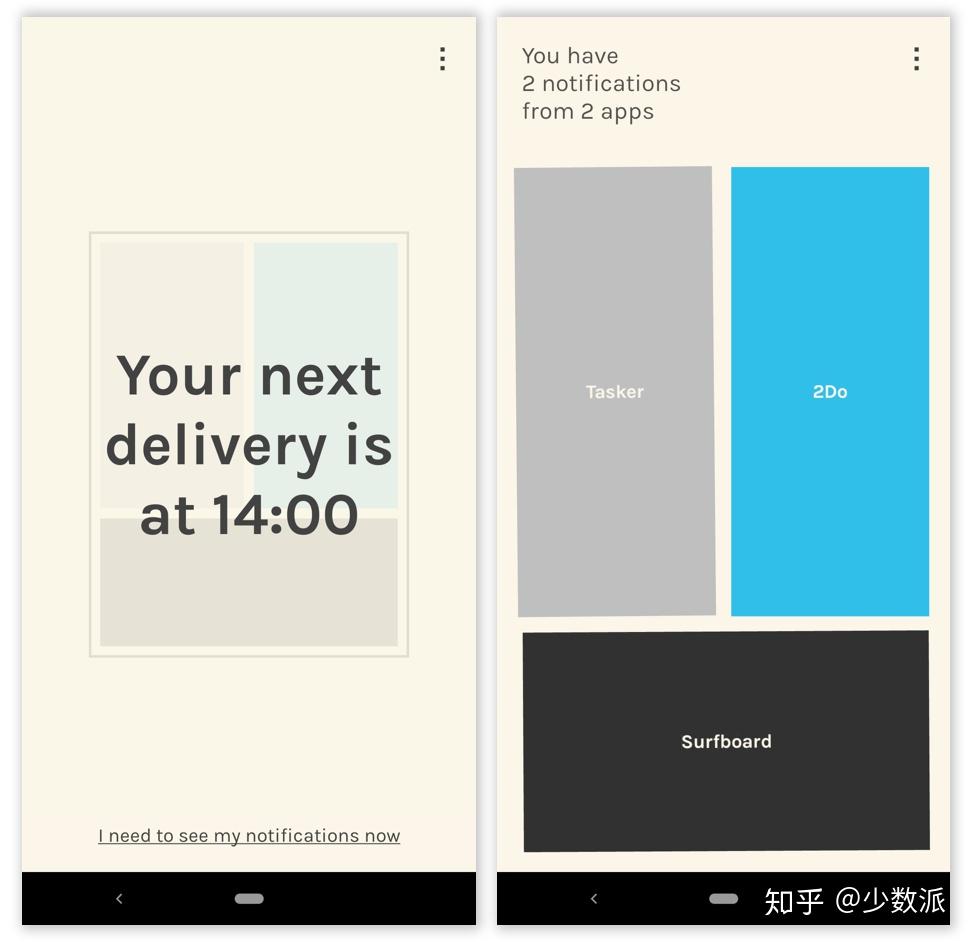 Post Box 的界面设计也很有趣,在开启之后,主界面采用了白色半透明遮罩的形式,我们隐约能够看到遮罩后面逐渐积累的色块,色块的大小会随着通知应用的增多而不断变化。谷歌熟知我们当下对于信息的焦虑,如果你看到通知不断积累又担心有重要事项,可以在应用内选择「立刻查看通知」。